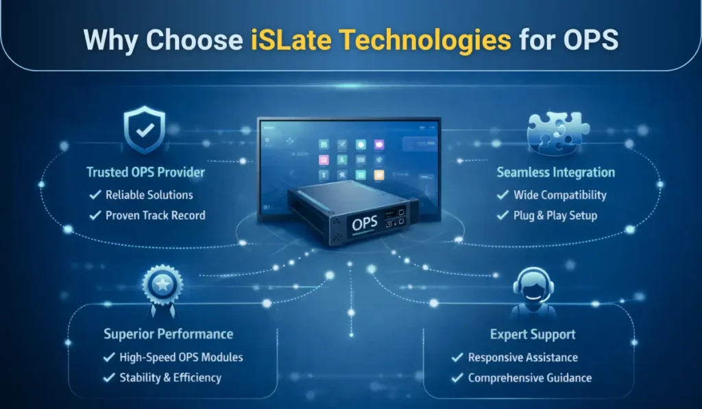 IT managers and system integrators choose iSLate Technologies because it delivers reliable, performance-driven OPS solutions that are engineered for real-world deployments. Rather than offering generic hardware, iSLate designs and supplies OPS modules and OPS-based interactive flat panels that are optimized for education, enterprise, and institutional environments where stability and long-term support matter most.